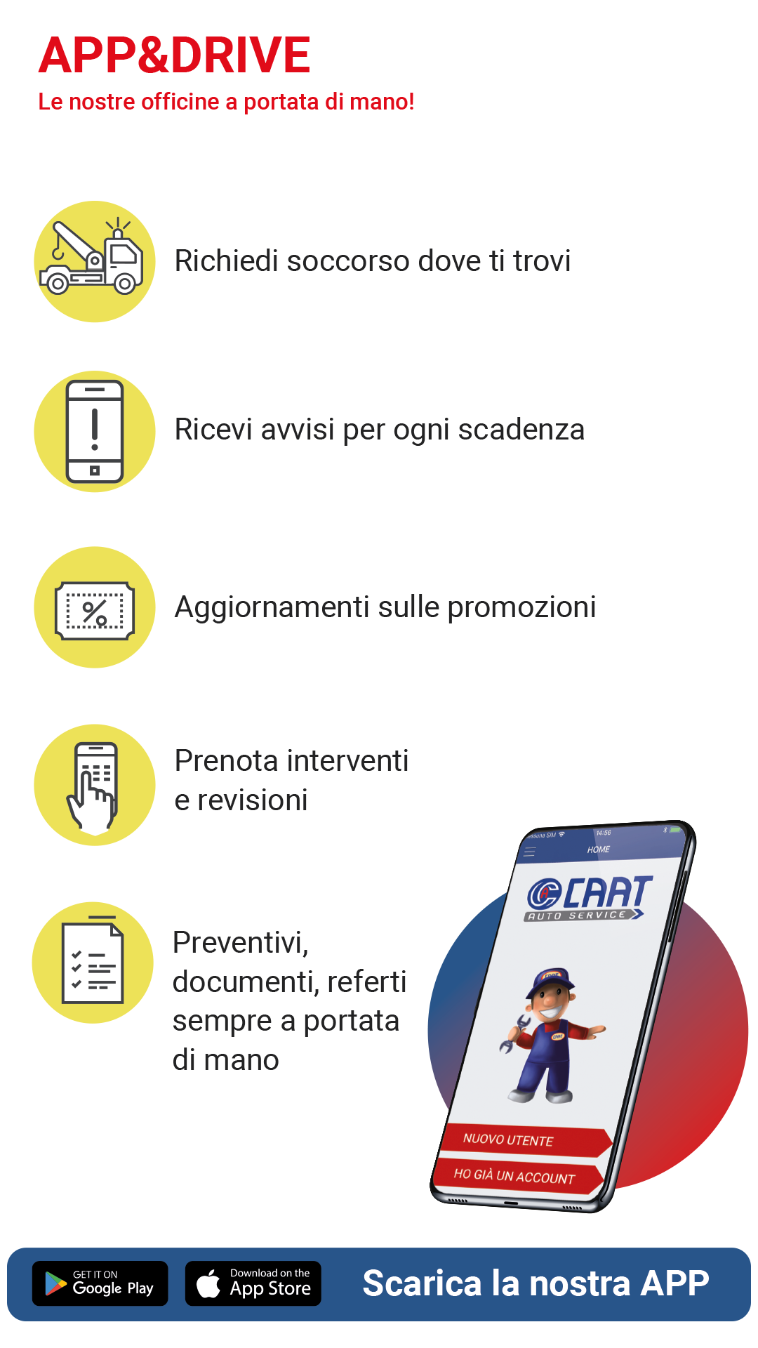 Chiedi il link personalizzato per associarti alla nostra officina e usufruire dei servizi: prenotare appuntamenti, ricevere i documenti, consultare lo storico dei veicoli, ricevere i promemoria di scadenze e appuntamenti e le tue promozioni dedicate e richiedere assistenza quando sei in panne.